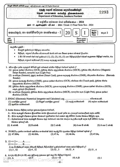 2024 Southern Province Grade 13 ICT 3rd Term Test paper with answers, available for download in Sinhala medium. You can access the Southern Province term test paper in PDF format using the link below.