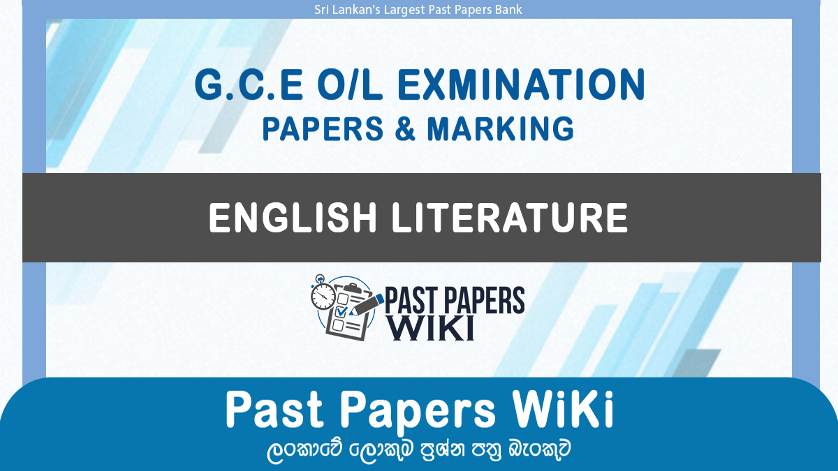 Download GCE O/L English Literature Past Papers with Answers.  You can download O/L English Literature Papers as a PDF files from the links below. MCQ, Structured, and essay official answers are available with these PDF files. We have a large collection of previous Past Papers with a Marking Scheme from the O/L English Literature Past Papers with Answers subject.