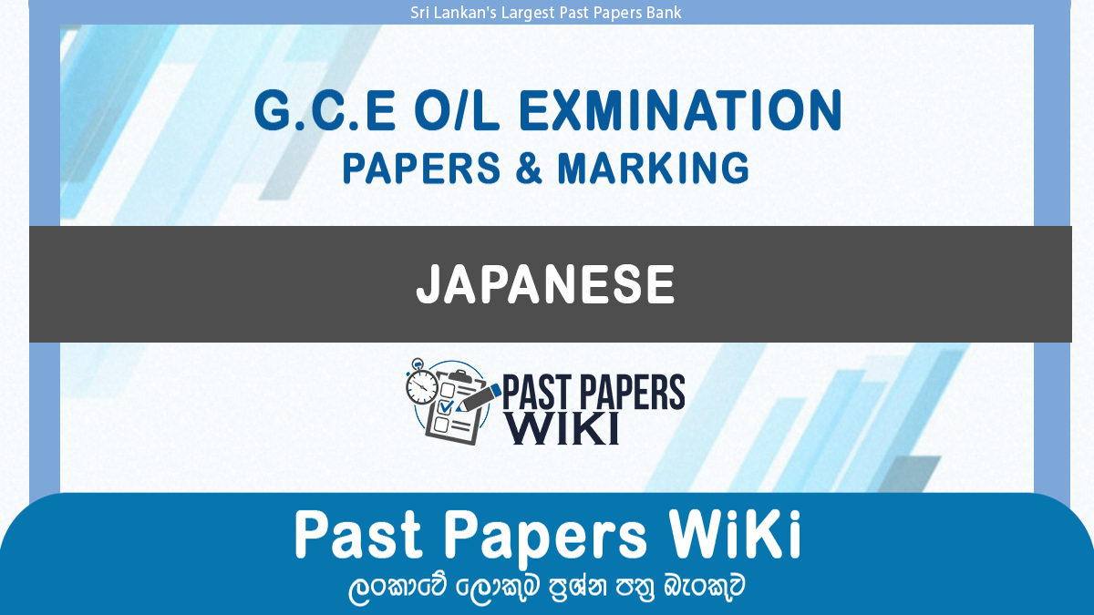 Download GCE O/L Japanese Past Papers with Answers. You can download O/L Japanese Papers as a PDF files from the links below. MCQ, Structured, and essay official answers are available with these PDF files. We have a large collection of previous Past Papers with a Marking Scheme from the O/L Japanese Past Papers with Answers subject.