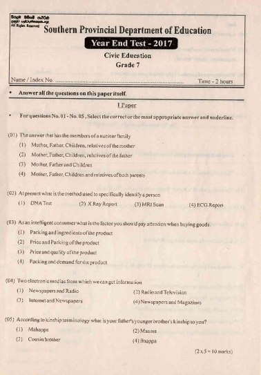 Grade 07 Civic Education 3rd term test paper 2017 in English Medium. This is the Southern Province’s third term test exam Paper conducted in 2017. All English Medium students can download grade 07 Civic Education past paper using the links below. It’s free to download.