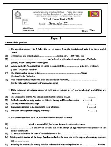 2022 North Central Province Grade 07 Geography 3rd term test paper with answers in English medium. The link below lets you download the North Central Province third term test paper as a PDF file.