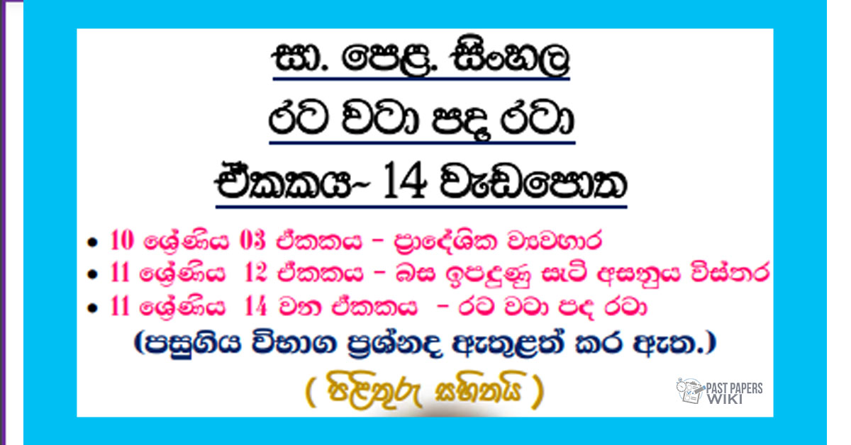 Download O/L Sinhala Language workbook covering unit 04 lesson Rata wata pada rata. Grade 10 Unit 03, Grade 11 Unit 12, and grade 11 unit 14 workbook and past examination questions and answers are also included. Download using the Link Below. It’s free to download.